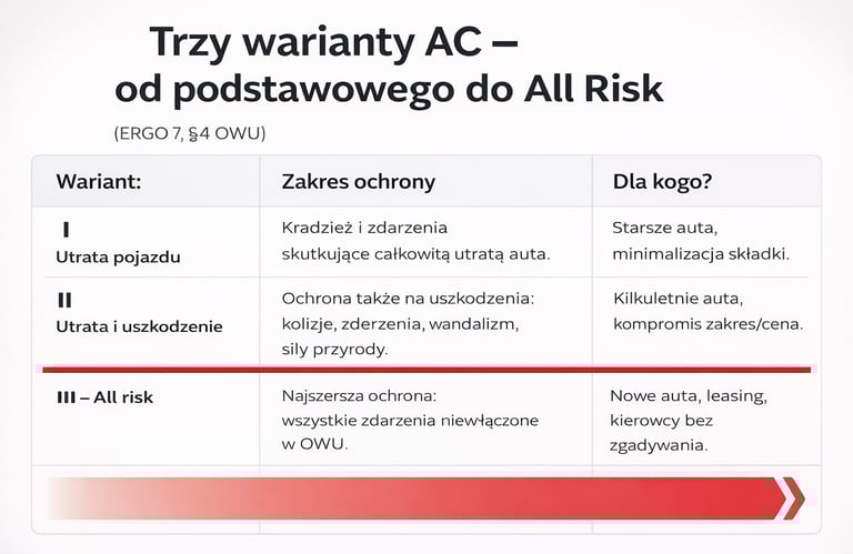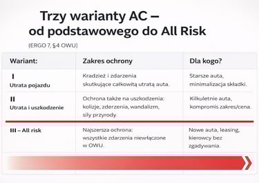 👉 Porównanie wariantów ERGO 7: AC mini, pełne, All risk + rozliczenie szkody (kosztorys/Sieć Partnerska/ASO), assistance i checklista pułapek.